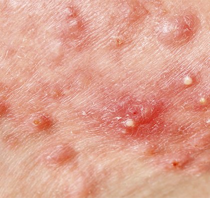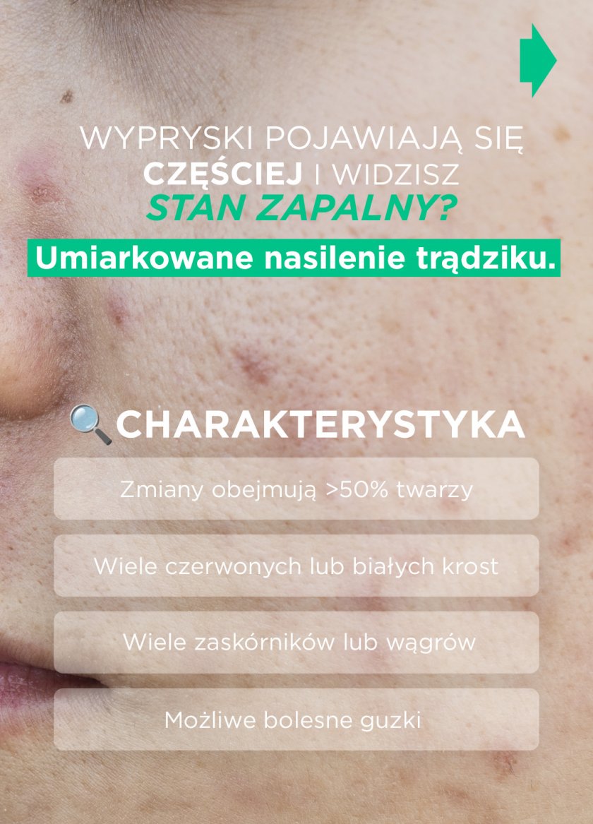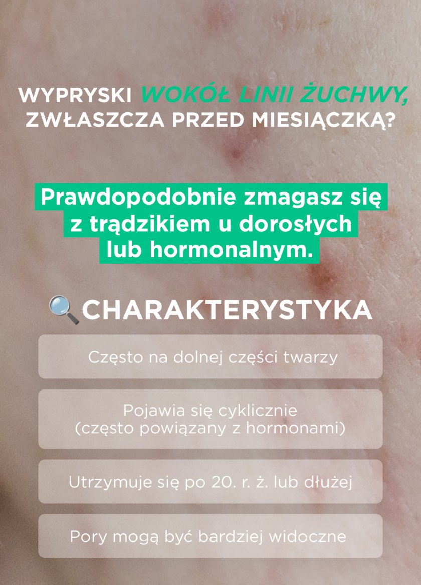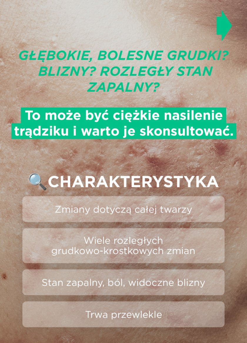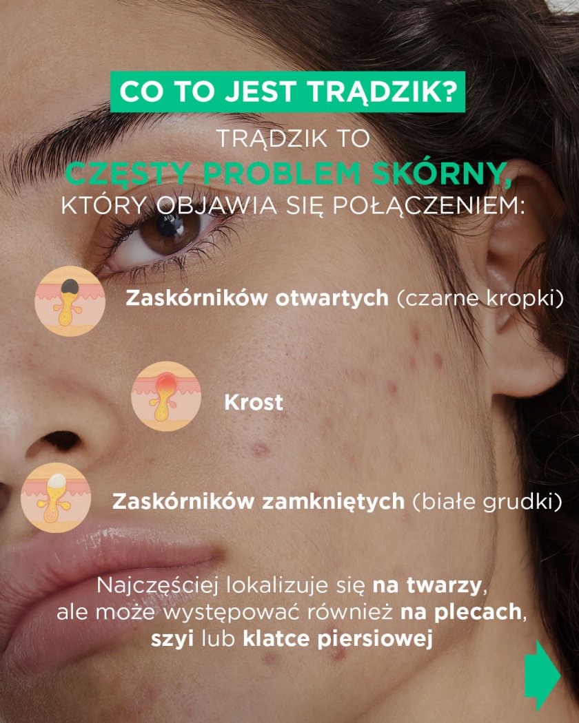 W efekcie powyższego pojawiają się zaskórniki, grudki, krosty, guzki czy torbiele. Najczęściej zmiany możemy zauważyć jako trądzik na twarzy, ale problem obejmuje też plecy, klatkę piersiową, ramiona oraz pozostałe partie ciała.